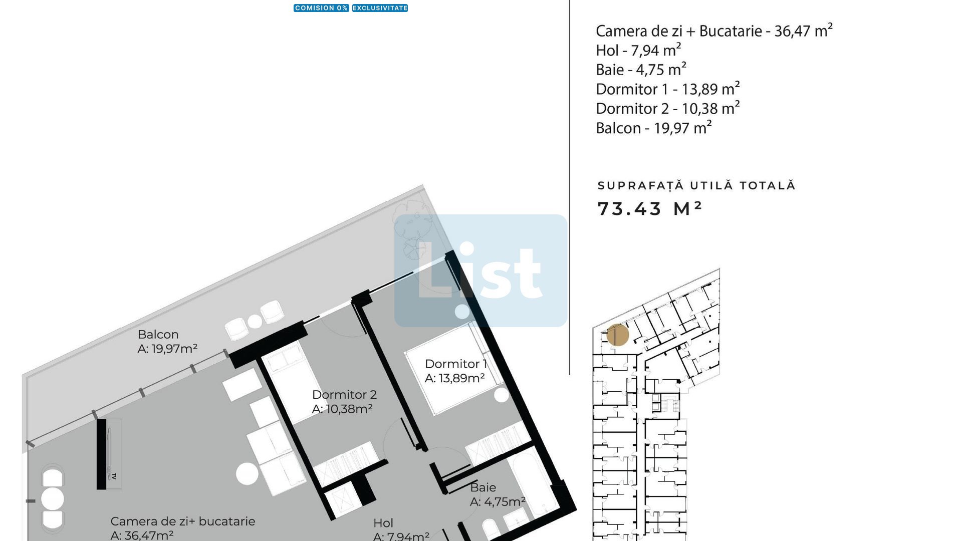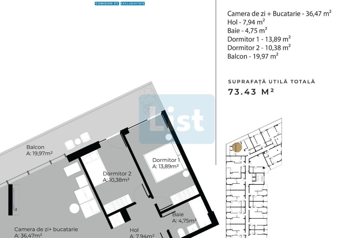 Apartamentul are o suprafață utilă de 73,43 mp, este situat la etajul 6 din 8 și beneficiază de orientare Nord-Vest, oferind lumină naturală plăcută pe parcursul zilei. Compartimentarea este practică și bine gândită: living spațios cu bucătărie open-space, 2 dormitoare, 1 baie și o terasă generoasă de 20 mp.