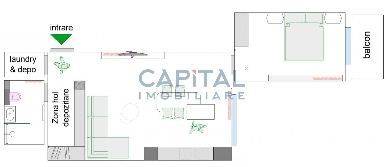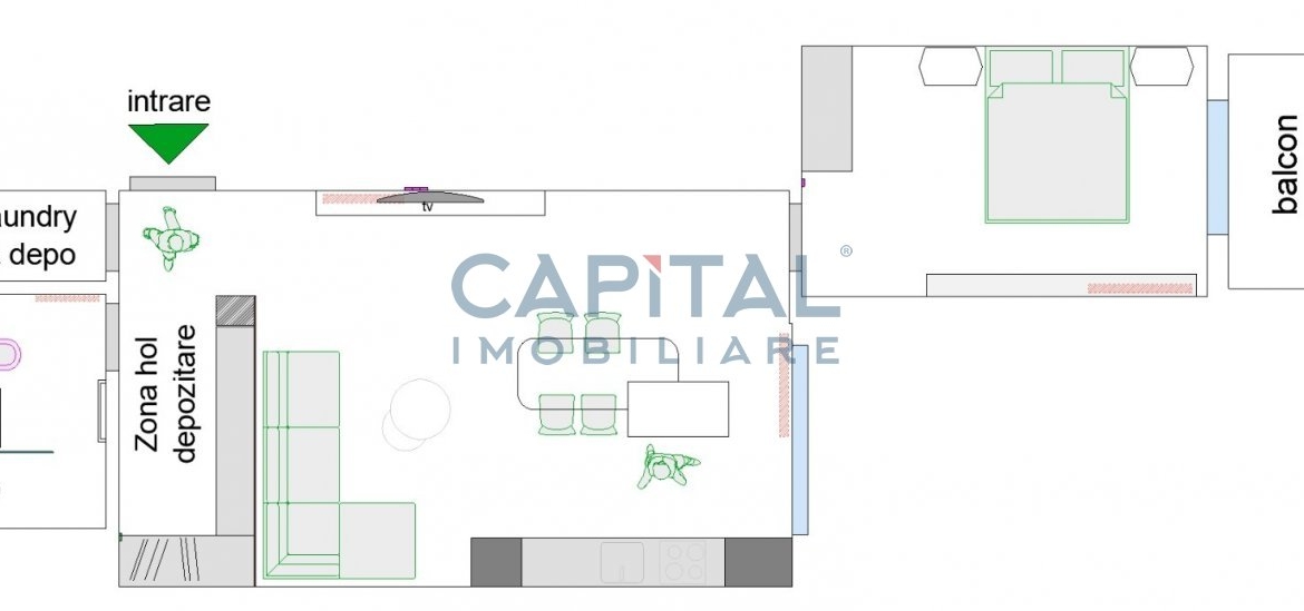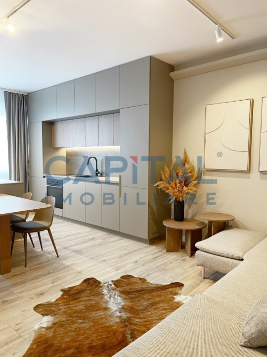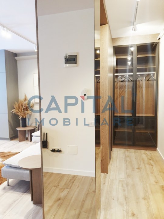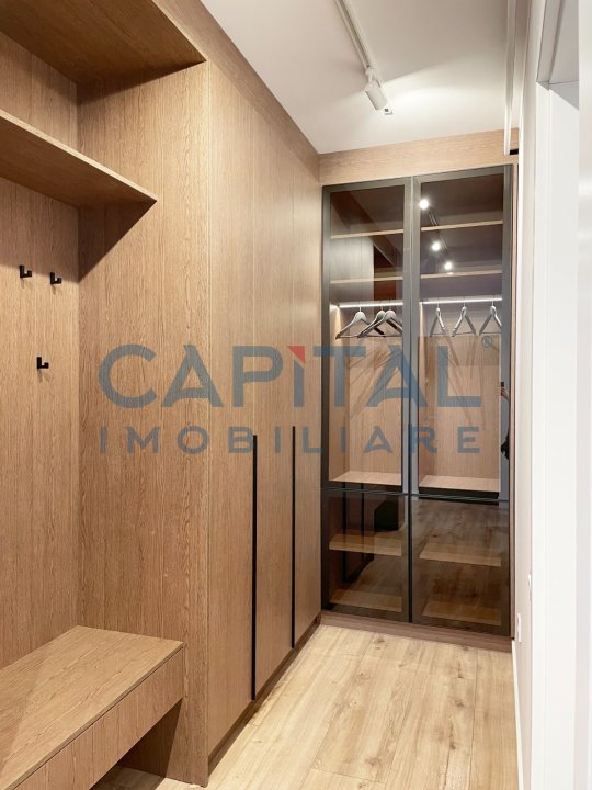 -living open-space cu bucatarie, insula, mobilata si utilata complet, hol cu cuier si mini dressing