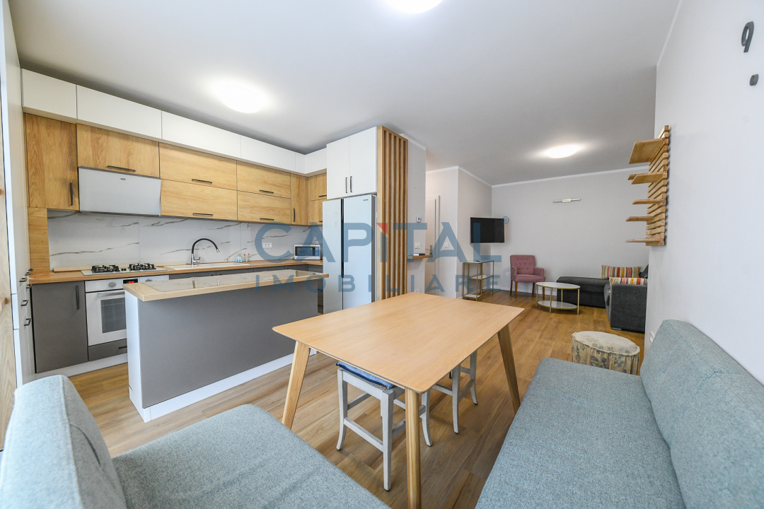 Living luminos cu bucătărie open-space