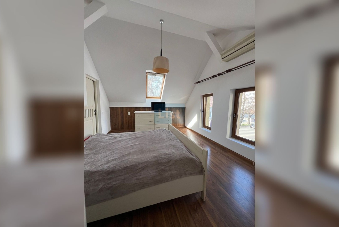 Apartamentul se afla intr-o cladire cu curte comuna la mansarada unei cladiri cu regim de inaltime parter cu mansarda. Suprafata utila este de 58,3 mp compartimentat astfel: camera de zi cu bucatarie, dormitor si baie cu geam.