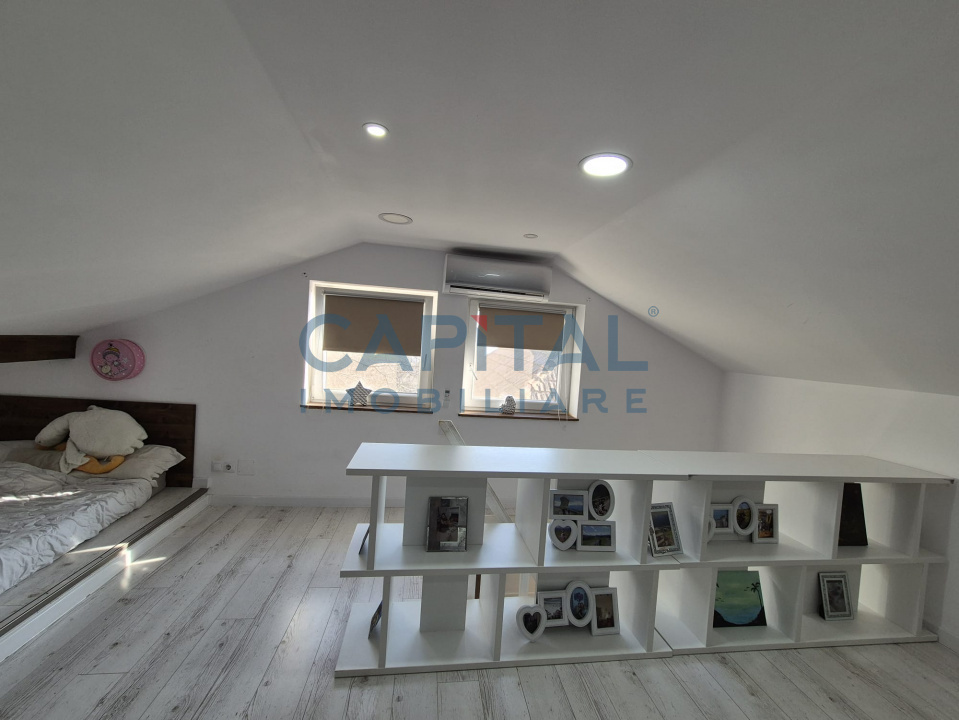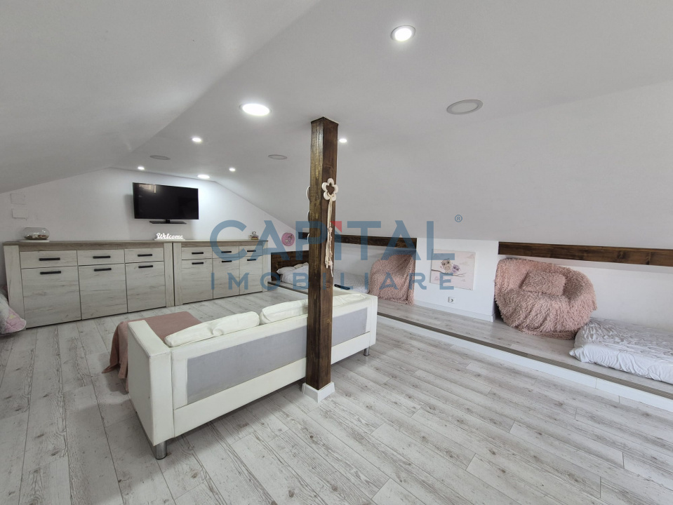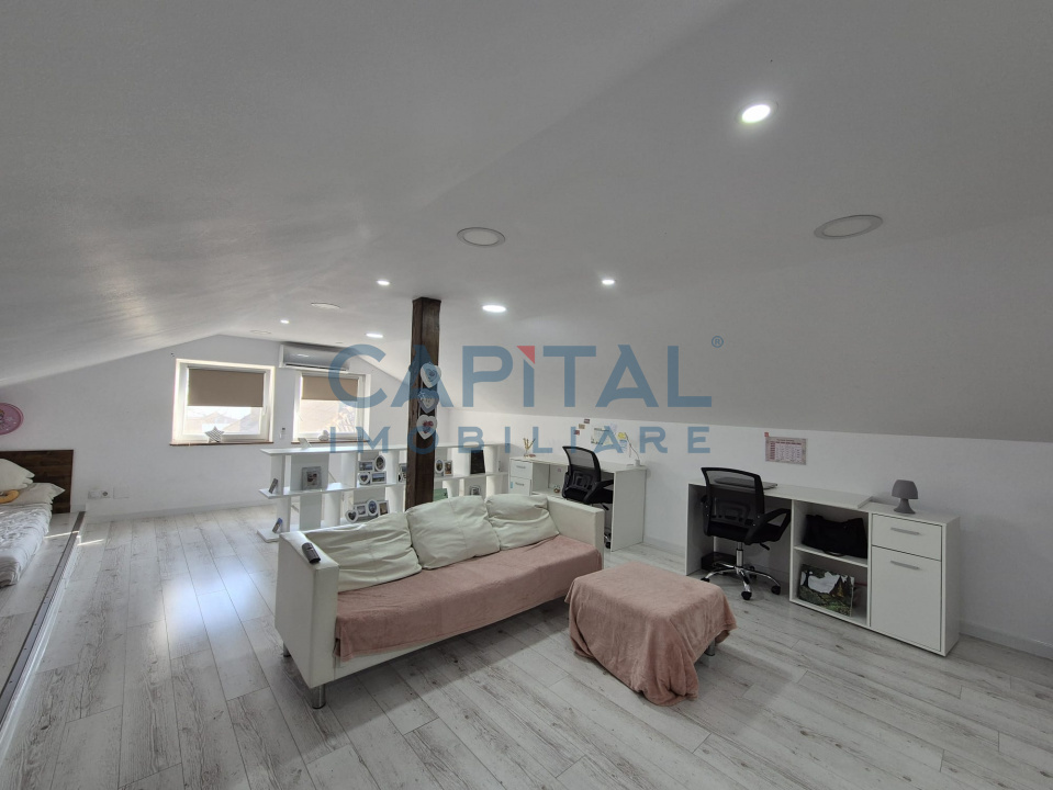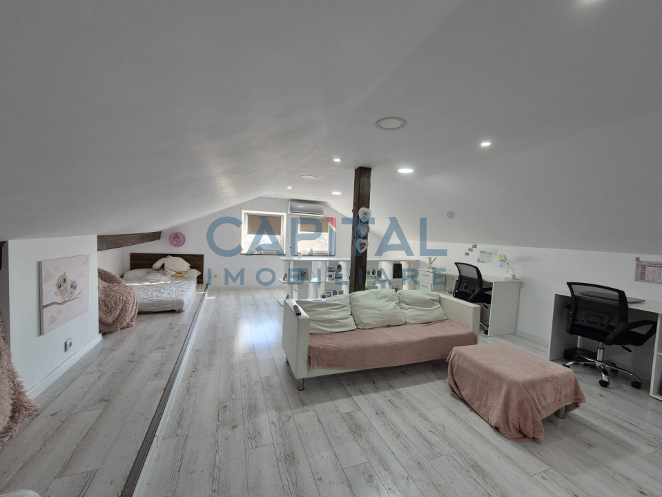 Locuinta dispune de living, bucatarie, camara, doua bai si trei dormitoare (cel de la mansarda este un open space de 40 mp utili).