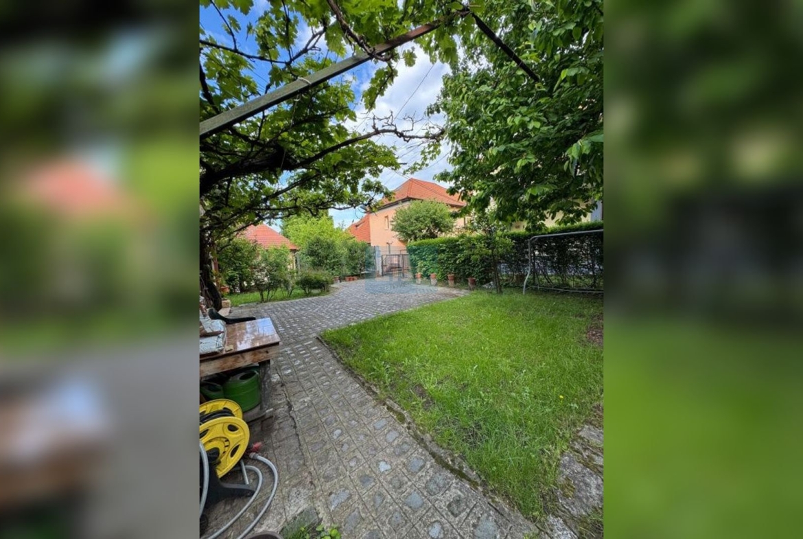 Curtea este amenajata cu gazon cu pomi si alee pavata, zona de gratar, magazie de depozitare,