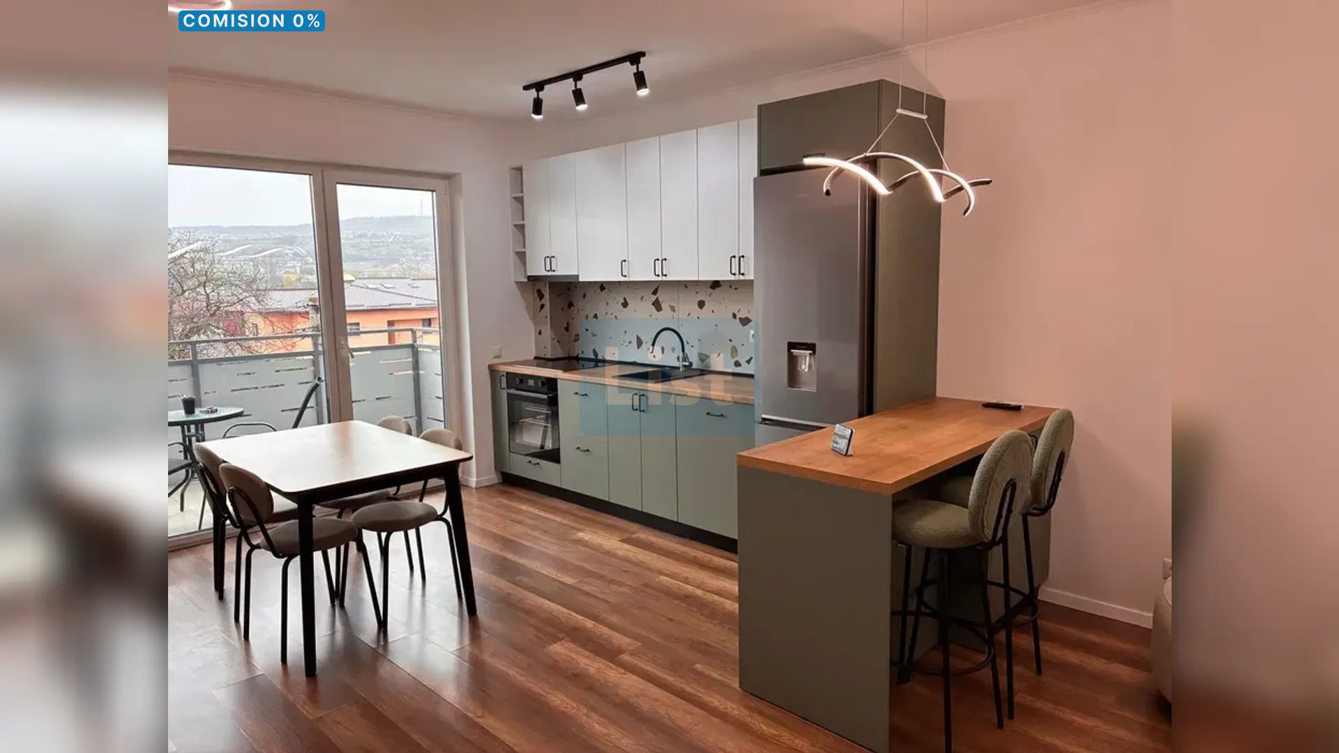 • Living open-space cu zonă de dining și bucătărie complet echipată