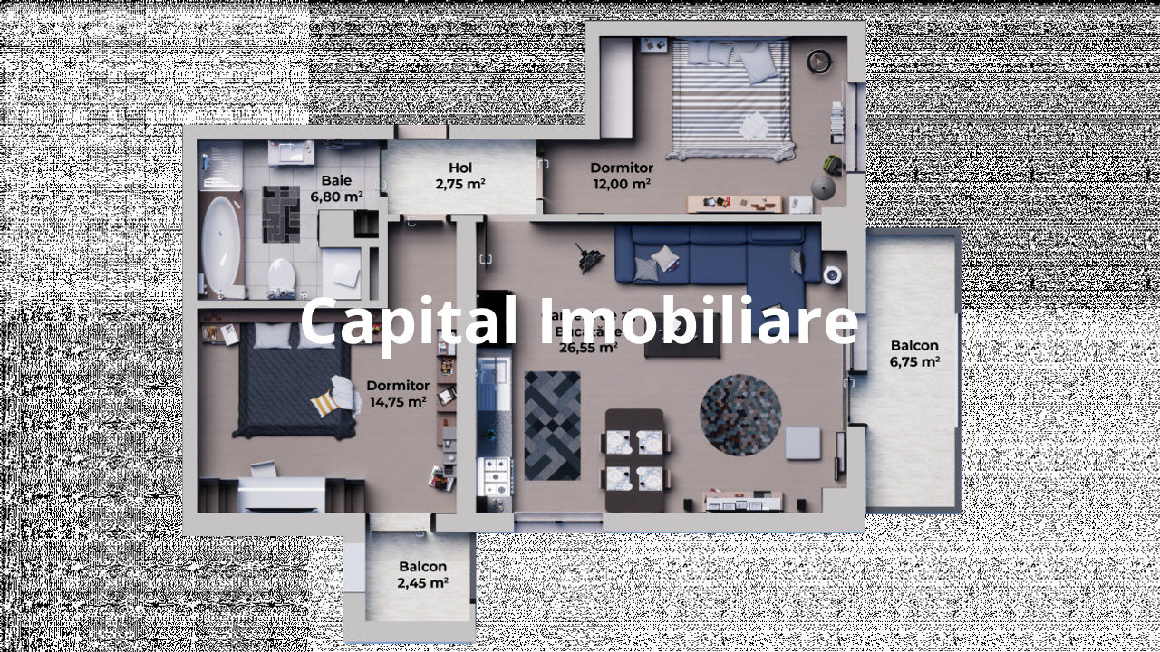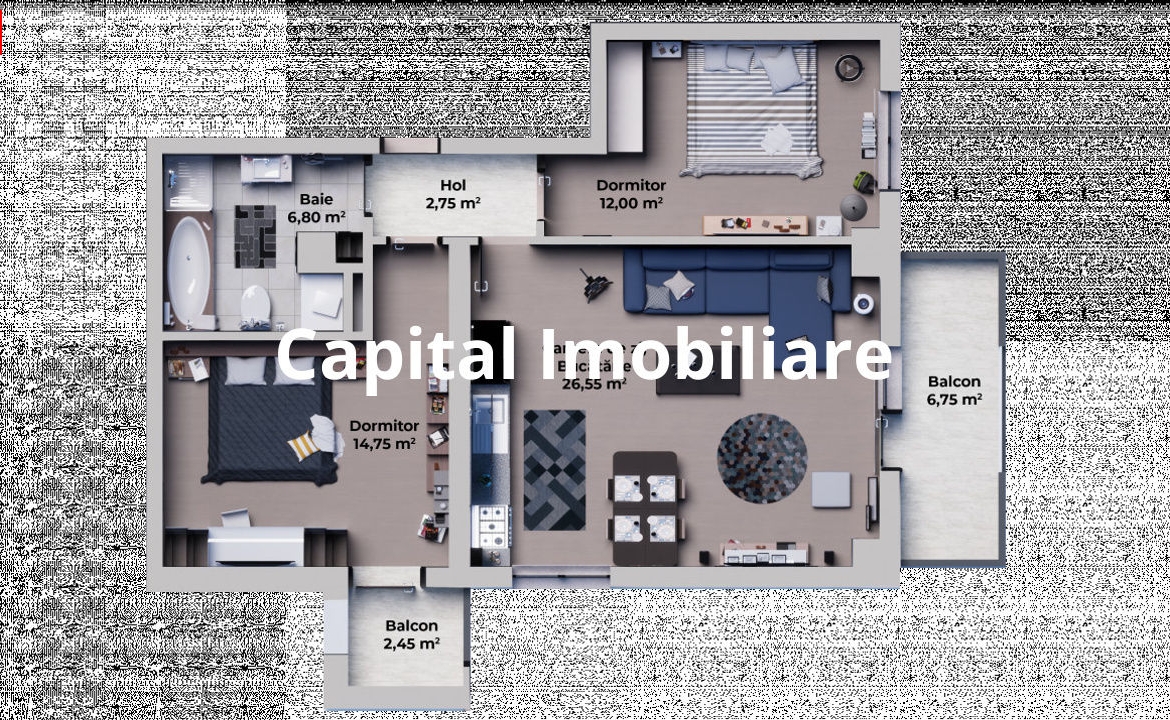 Capital Imobiliare propune spre vanzare un apartamjent cu 2 camere, . Locuinta dispune de o suprafata utila de 60 mp, avand compartimentare decomandata: Camera de zi: 19.9 m², Bucatarie: 12.80 m², Dormitor 1: 14.75 m², Baie mare: 6.80 m², Logie: 5,35 m², Balcon; 2,45 m². Apartamentul beneficiaza de: loc de parcare, usa exterioara metalica, usi interioare, gresie si faianta ( la alegerea clientului ) ,Parchet ( la alegerea clientului ), obiecte sanitare ( la alegerea clientului ), prize si intrerupatoare PVC Salamander cu geam termopan Low-E cu 3 foi de sticla si 5 camere, glafuri interior-exterior, balcon finisat la cheie Centrala proprie in condensare marca Saunier Duval+ senzor de gaz, distribuitor pentru instalatia de incalzire Incalzire in pardosea, pereti tencuiti, gletuiti si zugraviti in lavabila alba in 2 straturi, sapa, instalatii electrice trase pe pozitie cu tablou general si sigurante pentru consumatorii de putere, Instalatii pentru TV si internet trase pe pozitie, Interfon, racorduri apa-canal in bai si bucatarie, racord gaz metan in bucatrie. Apartamentul de 2 camere se preda la stadiul de cheie cu materiale pe care viitorii clienti le aleg. TVA-ul de 9% si locul de parcare suprateran este inclus in pretul apartamentului. Se pot achizitiona suplimentar boxe la subsolul blocului COMISION 0% PENTRU CUMPARATOR!!!!!!!!