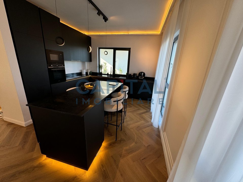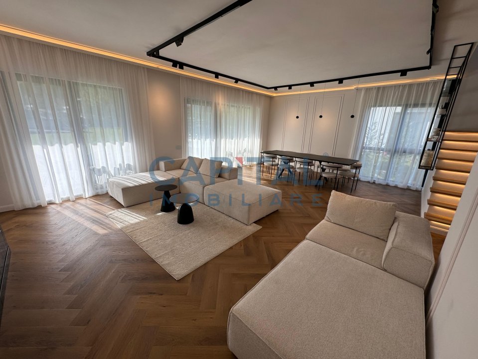 – parter: bucatarie, baie oaspeti, dressing intrare, living si dining open space, iesire pe terasa si curte