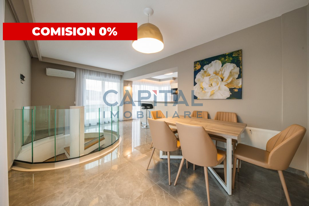 – al 2-lea nivel: zona de zi/loc servirea mesei, bucatarie open space, baie si terasa circulara generoasa de 146 mp, cu o superba panorama asupra intregului oras.