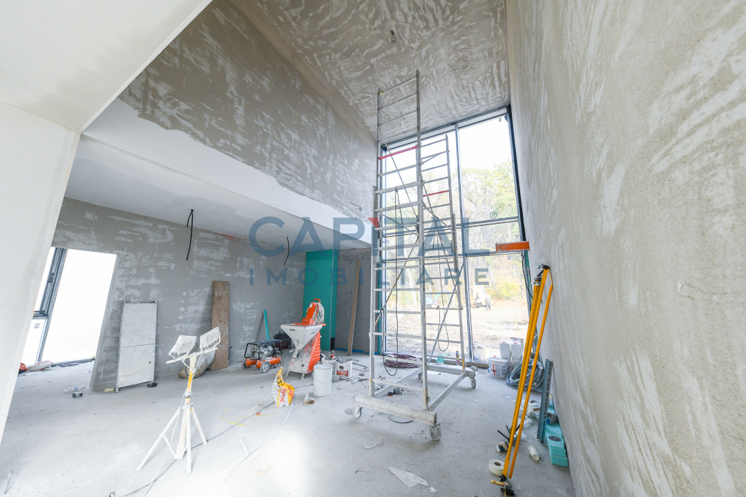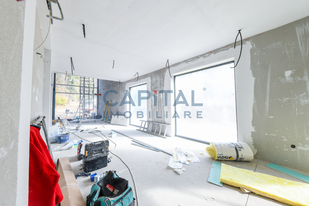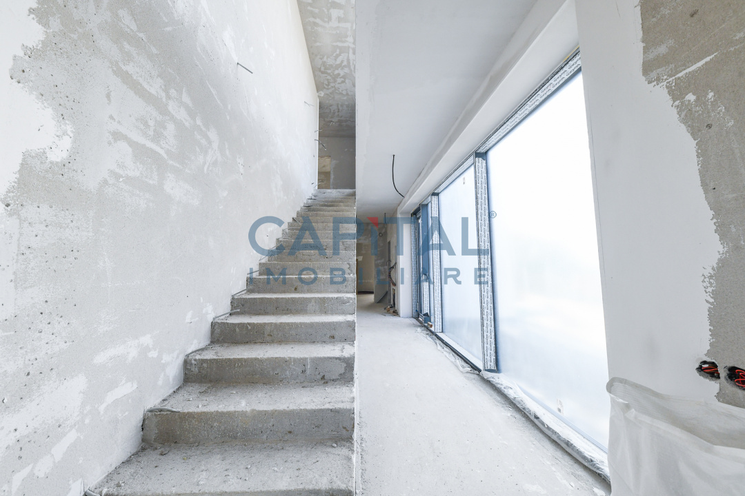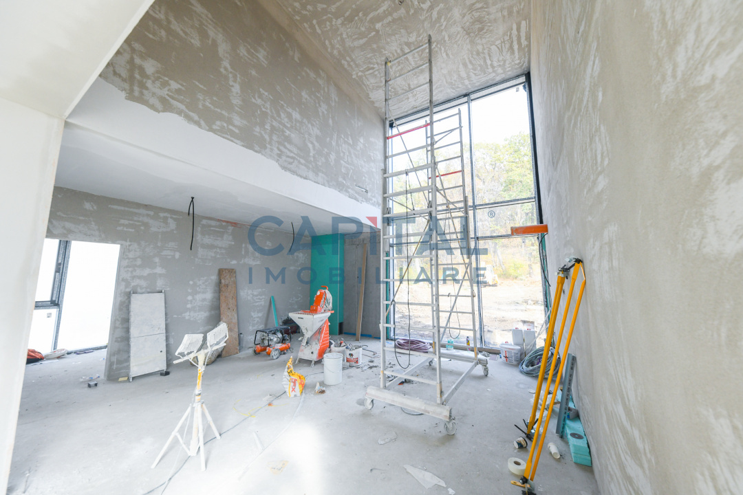 Construcția este realizată la standarde ridicate de calitate, cu pereți tip cortină din sticlă ce oferă lumină naturală abundentă și o legătură directă cu mediul exterior. Fațada ventilată este placată cu plăci ceramice de mari dimensiuni, asigurând un aspect contemporan și eficiență energetică ridicată. Vila dispune de 2 locuri de parcare în garajul subteran și de 3 terase private la etaj