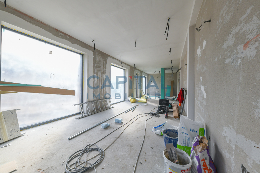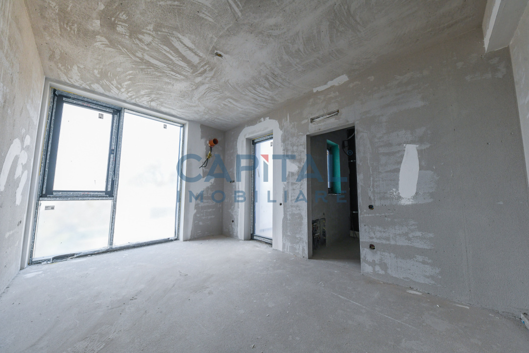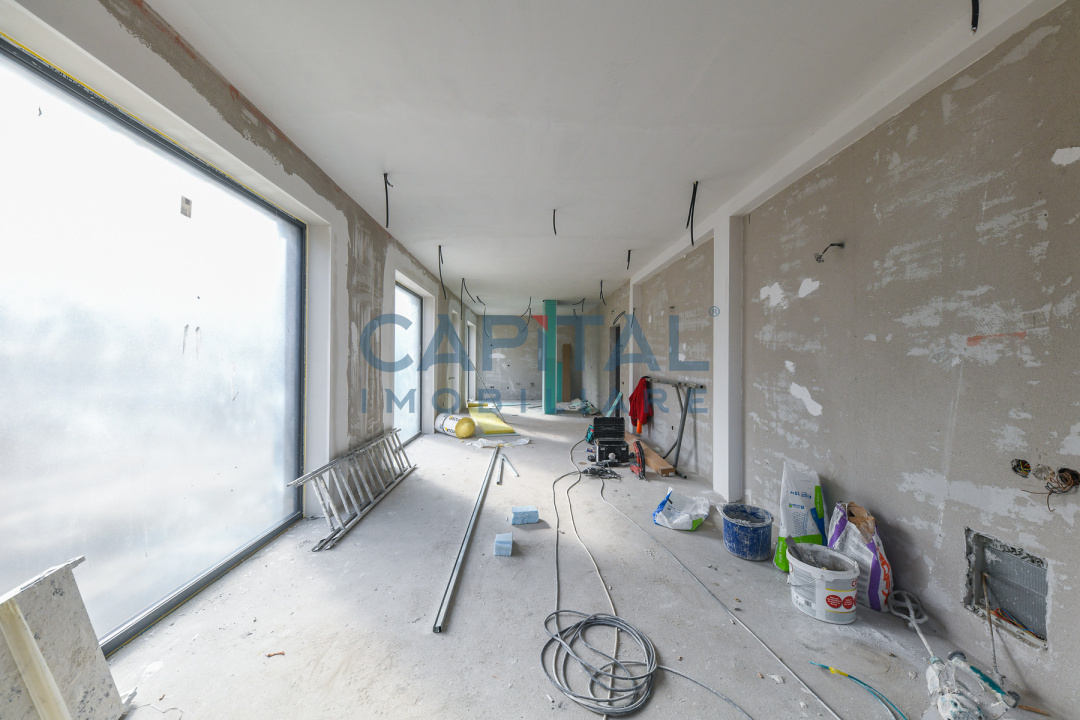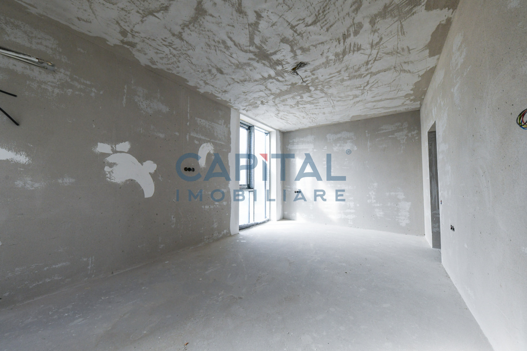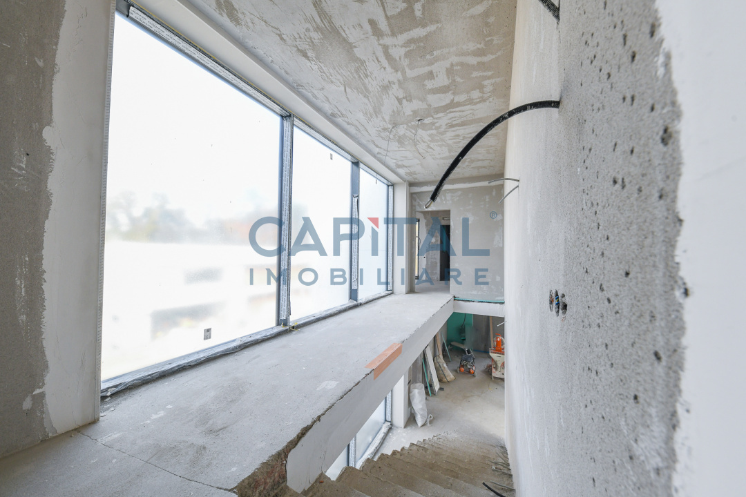 Construcția este realizată la standarde ridicate de calitate, cu pereți tip cortină din sticlă ce oferă lumină naturală abundentă și o legătură directă cu mediul exterior. Fațada ventilată este placată cu plăci ceramice de mari dimensiuni, asigurând un aspect contemporan și eficiență energetică ridicată. Vila dispune de 2 locuri de parcare în garajul subteran și de 3 terase private la etaj