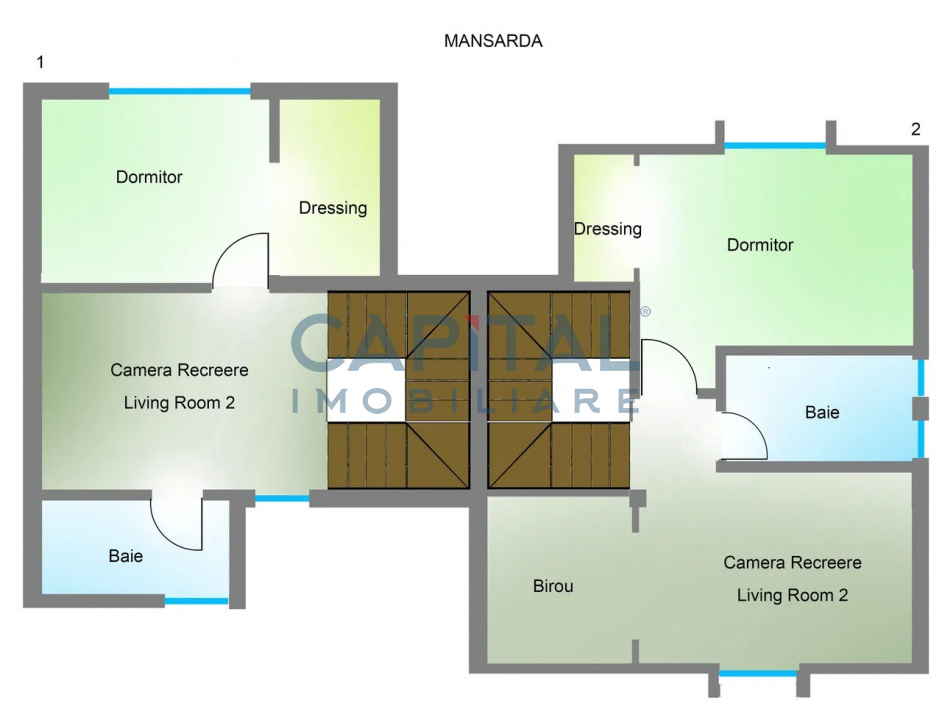 • Mansardă: un dormitor cu dressing, cameră de recreere, baie și hol