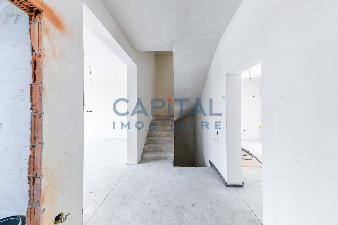 Demisolul include un garaj pentru două autoturisme, spațiu tehnic și hol de acces. Parterul este compartimentat într-un living spațios, bucătărie separată, baie, hol și balcon. Etajul cuprinde un dormitor matrimonial, două dormitoare, dressing, baie, hol și balcon. Etajul retras este format dintr-o cameră, baie și o terasă circulabilă generoasă, finisată cu pardoseală flotantă.