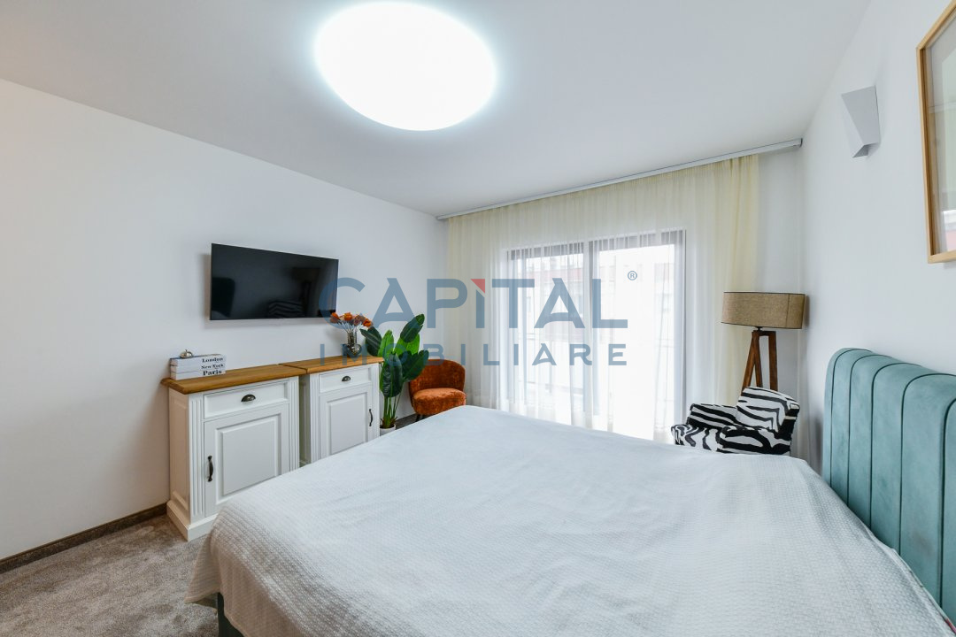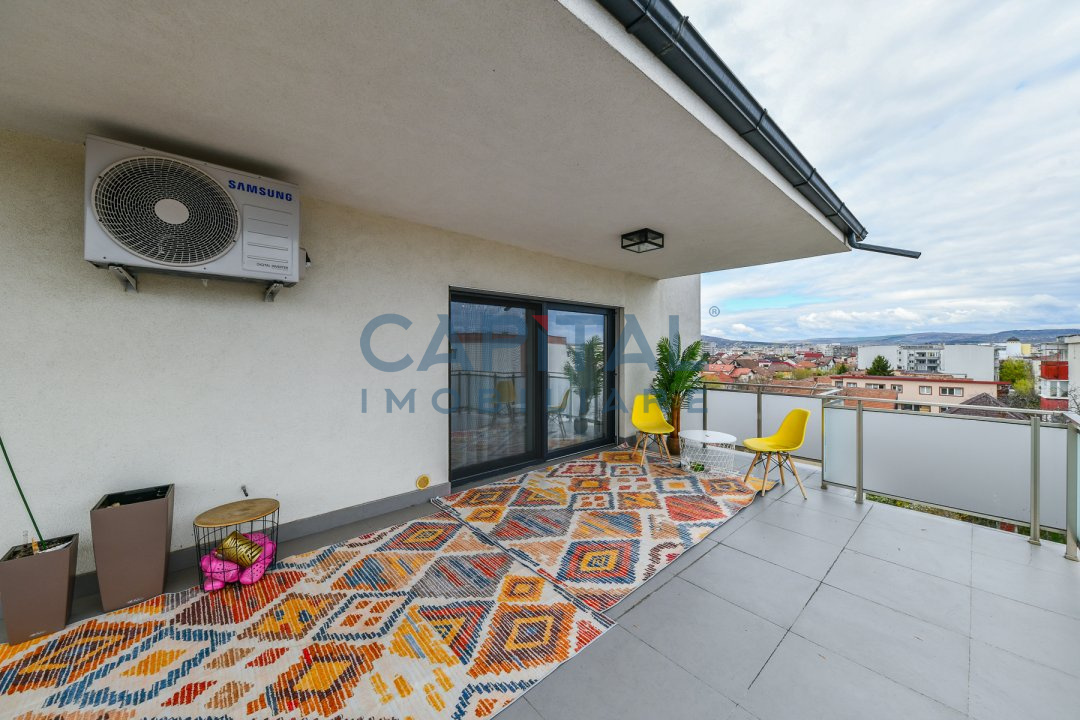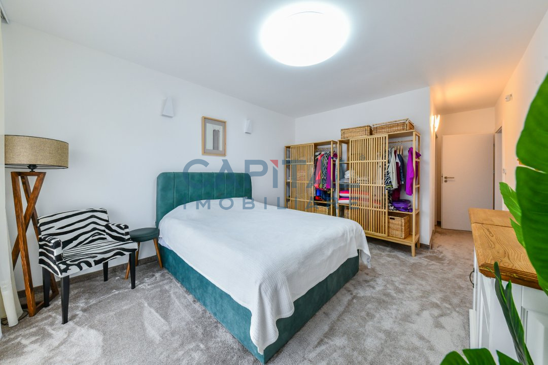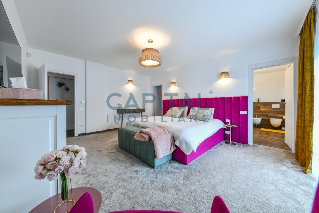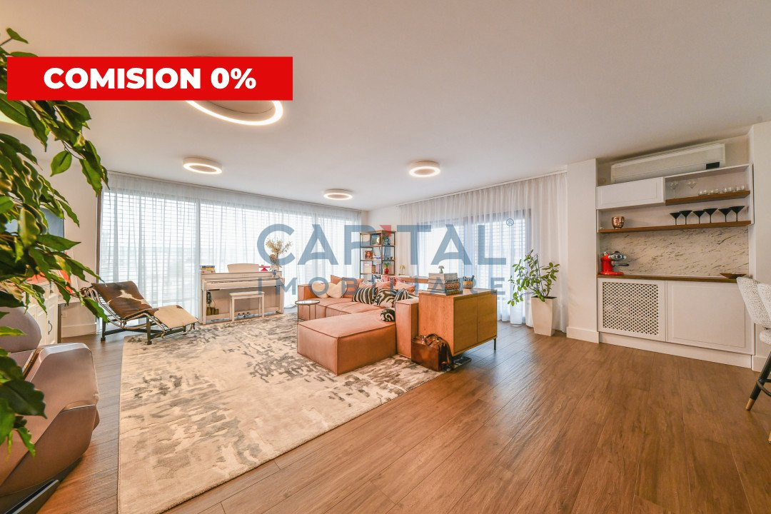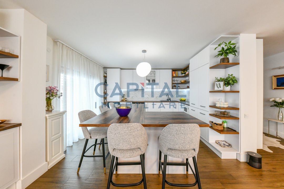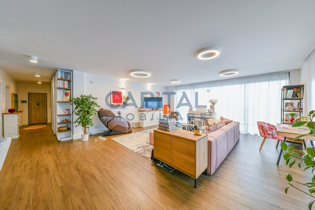 Este pozitionat la etajul 4 intr-o cladire cu 4 etaje construita in anul 2017 prevazut cu lift, avand orientare nord-sud-estica. Suprafata utila este de 151 mp si este compartimentat astfel: hol cu dressing, camera de zi cu bucatarie, al doilea hol cu biblioteca si zona de citit, dormitor matrimonial cu baie si dressing, al doilea dormitor cu baie proprie, baie de serviciu, spatiu tehnic – spalatorie/uscatorie si depozitare, balcon de 16.43mp, terasa de 31.84mp.