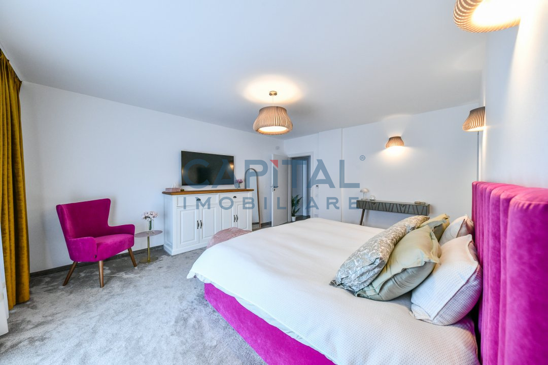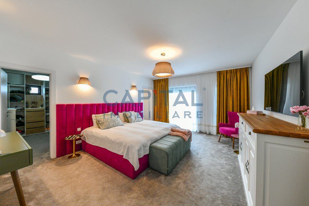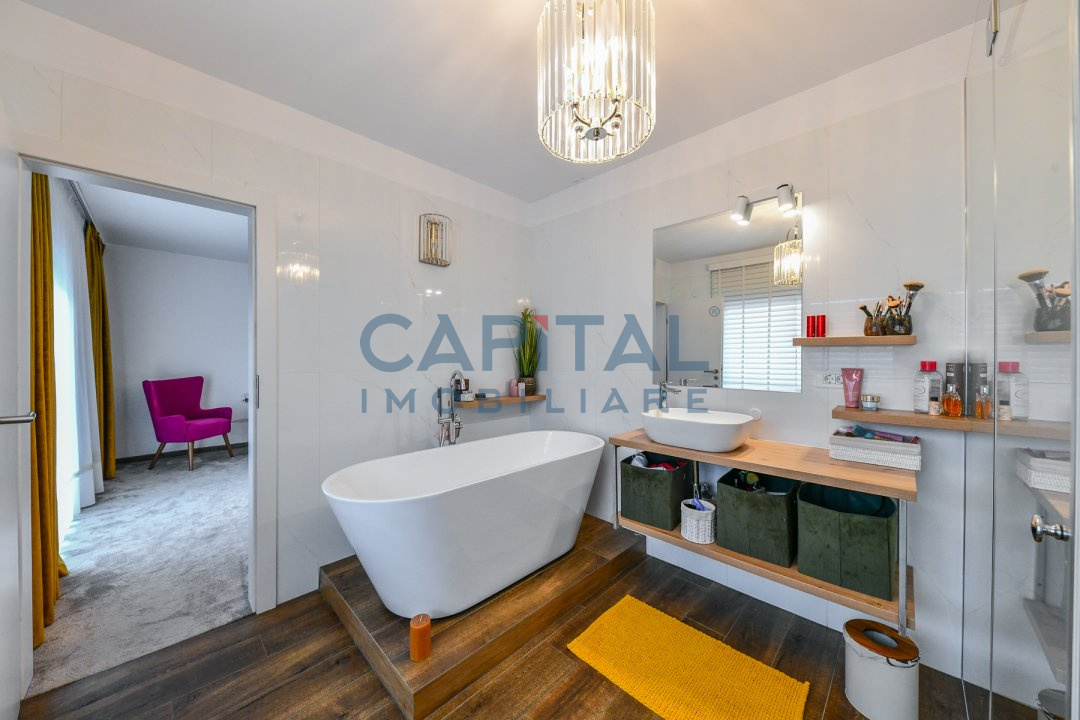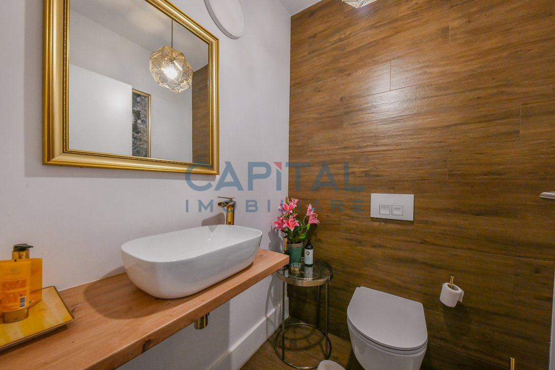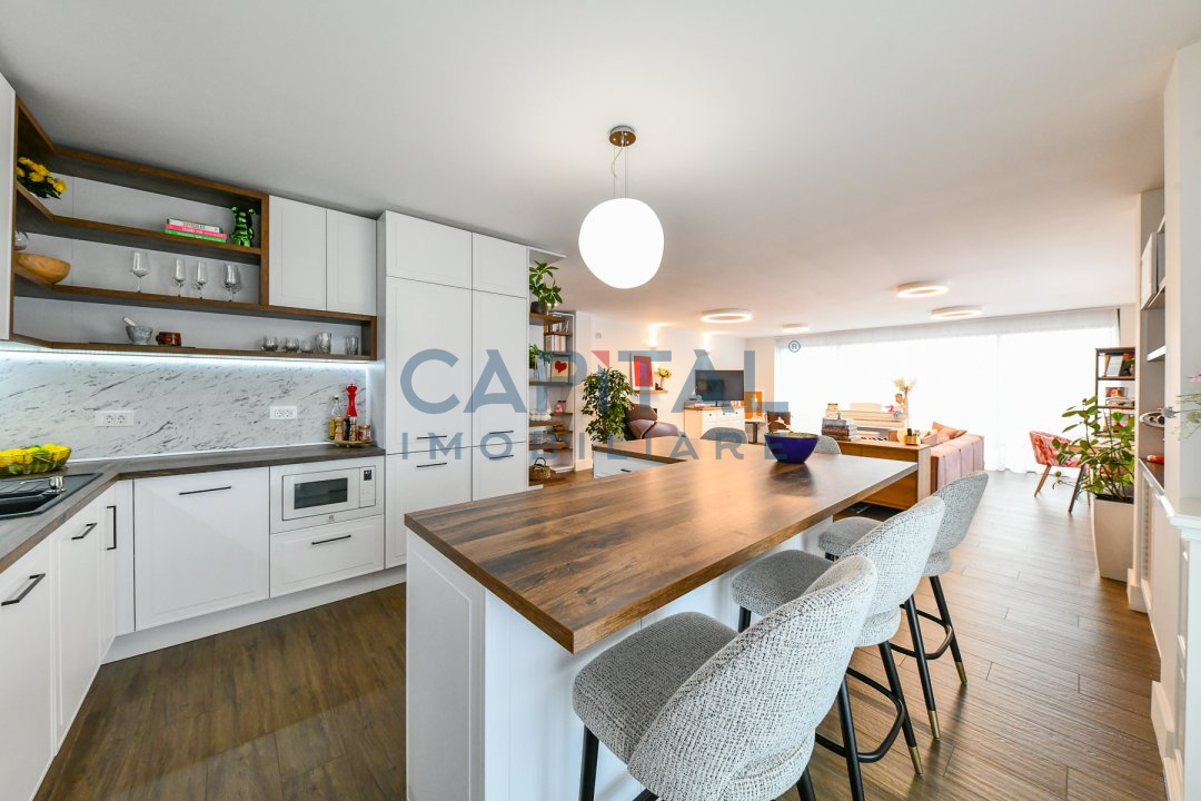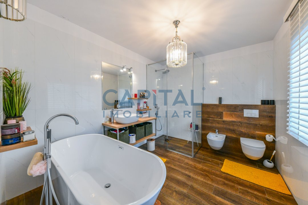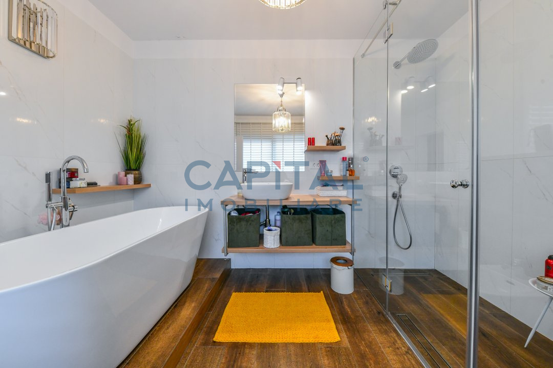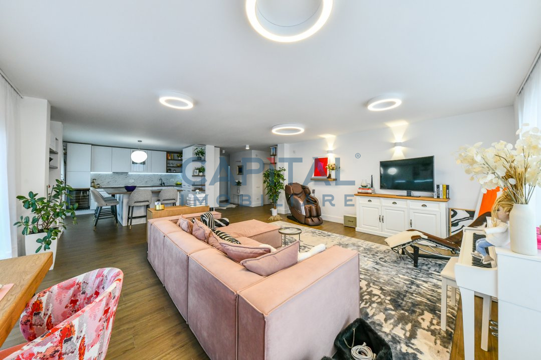 Dispune de centrala termica proprie cu incalzire in pardoseala, aer conditionat, detine finisaje de calitate, mobila la comanda din mdf, usi interioare albe din mdf, masina de spalat vase, masina de spalat rufe, combina frigorifica, frigider de vinuri incorporat, alte electrocasnice de bucatarie.