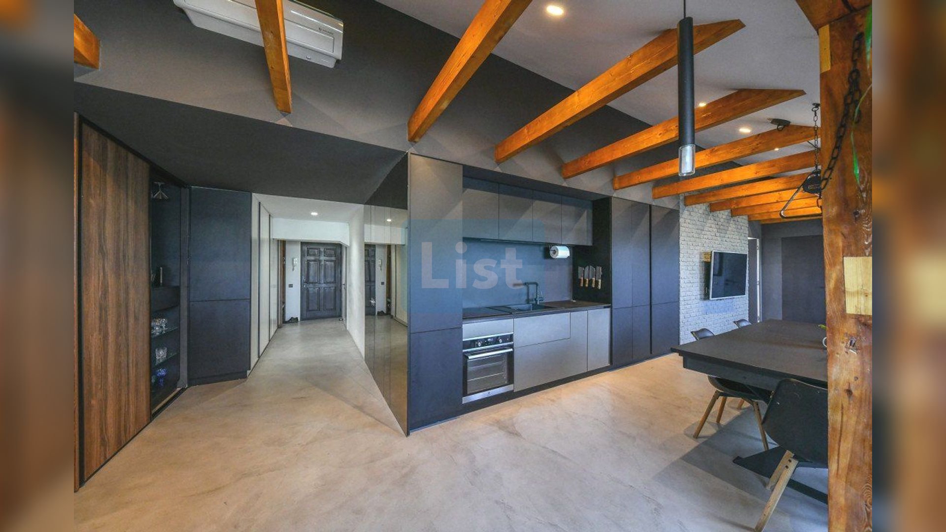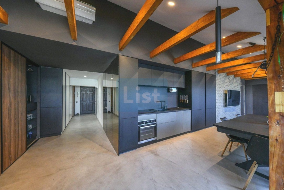 Toata mobila din apartament este facuta la comanda. Bucataria este din mdf, este utilata cu cuptor electric, plita electrica, masina de spalat vase, combina frigorifica si un frigider pentru vinuri.